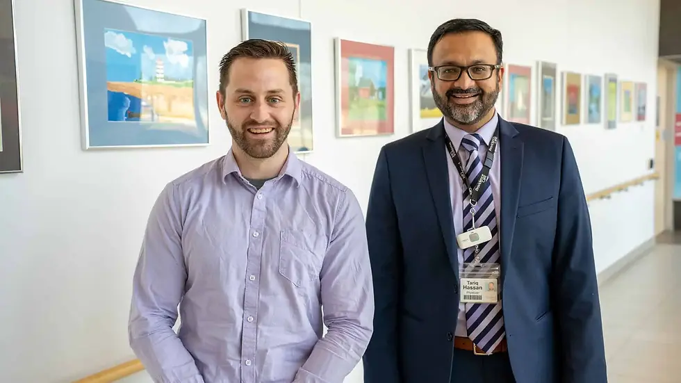 Providence Care outpatient Tyler Potvin poses for a photo with his physician, Dr. Tariq Hassan, at Providence Care Hospital.